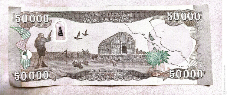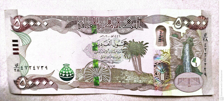 اسکناس 50000 دینار عراقی که در معاملات عامیانه مردم عراق با حذف ۳ صفر معادل پنجاه دینار عراق میشه که به معادل پول ایران برابر ۵۰۰۰۰× قیمت روز دینار