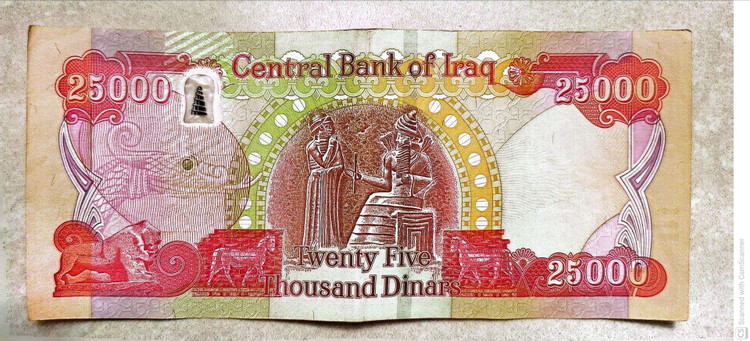 اسکناس 25000 دینار عراقی که در معاملات عامیانه مردم عراق با حذف ۳ صفر معادل بیست و پنج دینار عراق میشه که به معادل پول ایران برابر 25000× قیمت روز دینار
