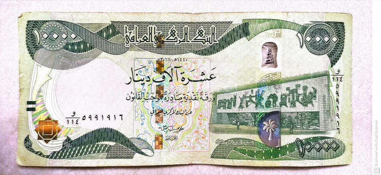 اسکناس 10000 دینار عراقی که در معاملات عامیانه مردم عراق با حذف ۳ صفر معادل ده دینار عراق میشه که به معادل پول ایران برابر 10000× قیمت روز دینار