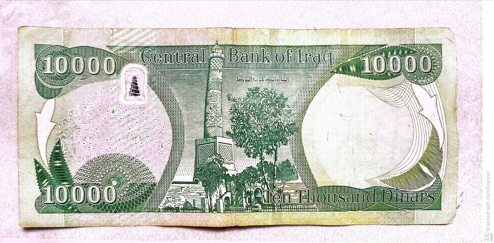 اسکناس 10000 دینار عراقی که در معاملات عامیانه مردم عراق با حذف ۳ صفر معادل ده دینار عراق میشه که به معادل پول ایران برابر 10000× قیمت روز دینار