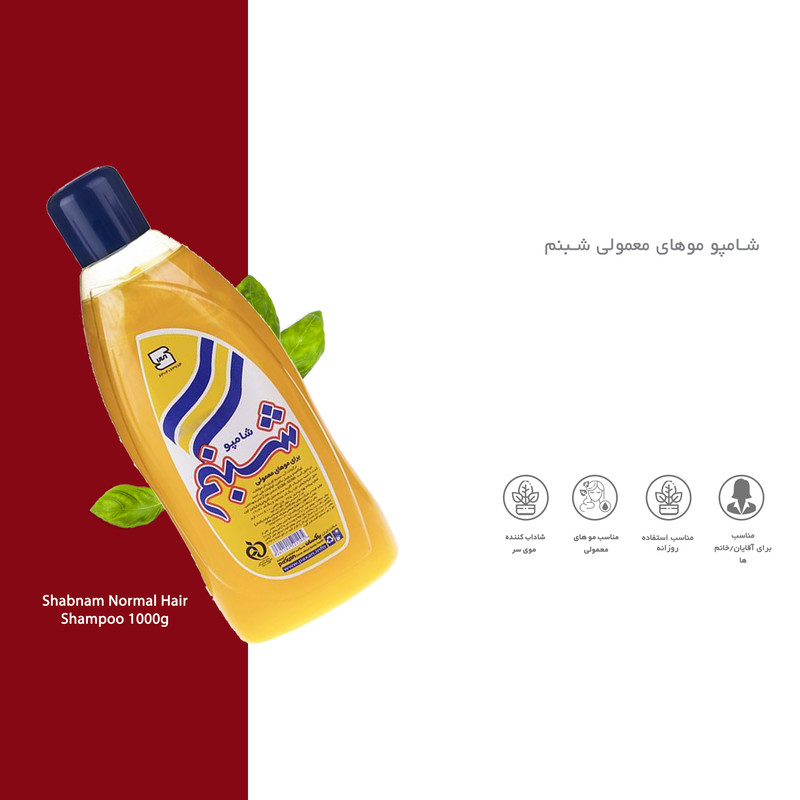 یکی از مواد بهداشتی لازم که در تمامی حمامها وجود دارد و برای شستوشوی سر استفاده میشود شامپوها هستند. یکی از این شامپوها، شامپو موهای معمولی شبنم در مقدار 1000 گرم است. شبنم یکی از برندهای قدیمی، قدمتدار و محبوب است که با حفظ کیفیت و اصالت تولید، تا به امروز مشتریان خود را راضی نگهداشته است. این شامپو مورد استفاده بانوان و آقایان است. افرادی که دارای موهای معمولی هستند میتوانند از این شامپو استفاده کنند. این شامپو برای مصارف روزانه بوده و دارای کف مطلوب به همراه آبکشی آسان است. شامپو موهای معمولی شبنم مقدار 1000 گرم ساخت ایران بوده و دارای مجوز از سوی سازمان غذا و دارو برای حفظ سلامتمحور بودن است. این شامپو دارای عصاره و ویتامین نیست ولی شستوشوی کاملی را به مصرفکننده ارائه میدهد.